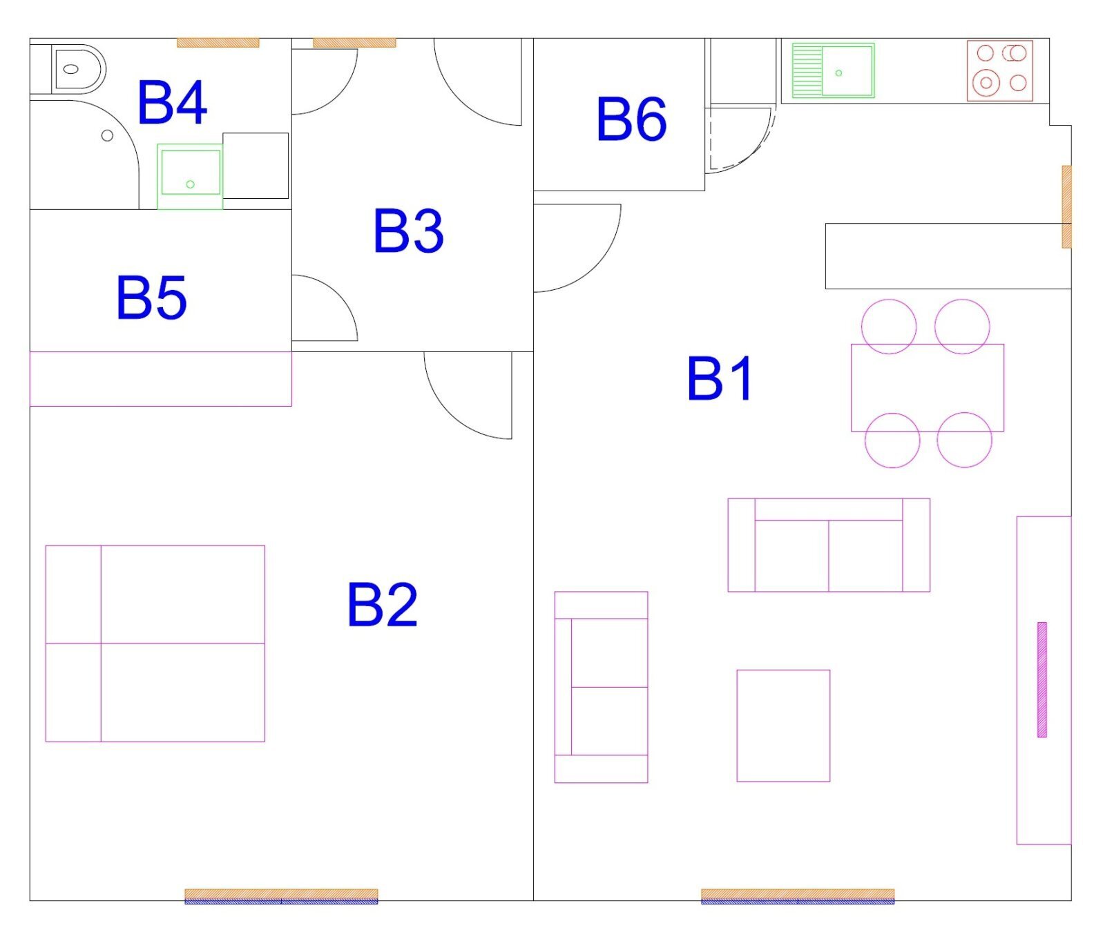 Předsíň B3 (6,67 m2); komora (B5 - 3,01 m2); koupelna vč. WC, pračka (B4 - 3,77 m2) – sprchový kout; obývací kuchyně (B1 - 35,73 m2) – sklokeramická deska, myčka, lednička s mrazákem; spíž (B6 -1,96 m2); pokoj (B2 - 23,28 m2).
