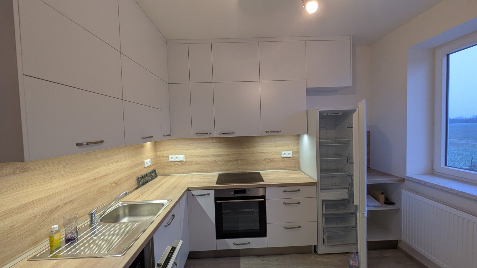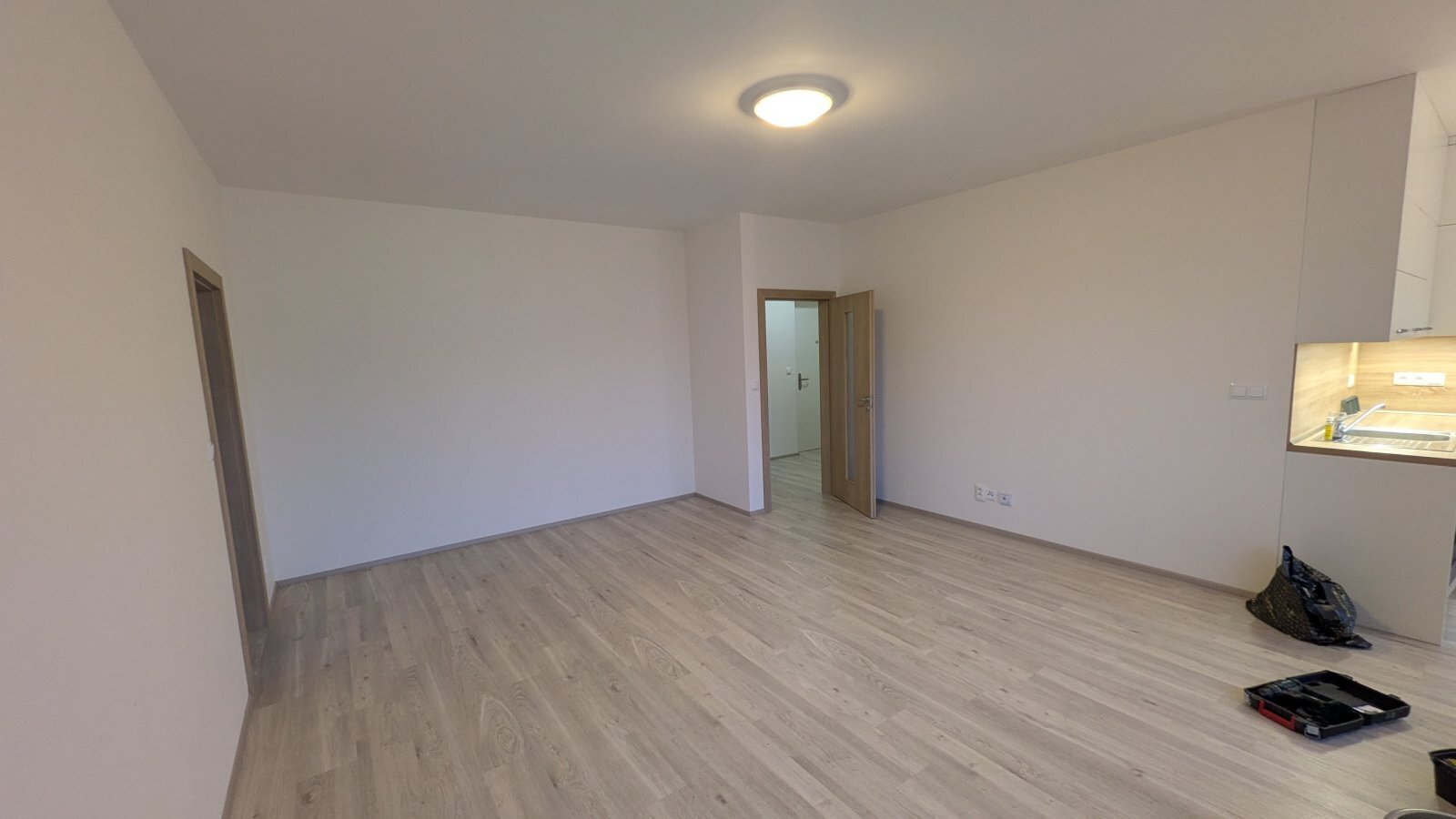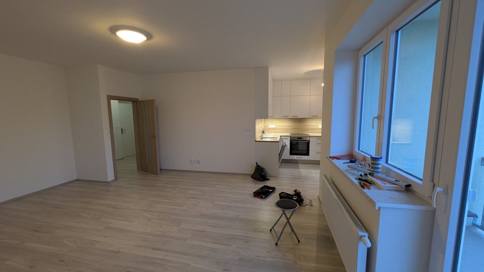 Dispozice zahrnuje světlou obývací kuchyní (cca 25,30 m²) s balkónem se severozápadní orientací a luxusní kuchyňskou linkou na míru se spotřebiči, dva pokoje (cca 11,80 m² a 11,70 m²), velkou koupelnu s vanou a WC (cca 6,30 m²).