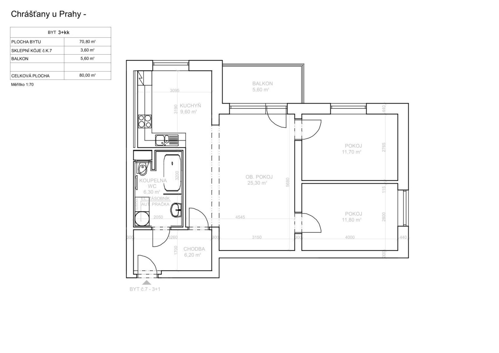 Byt o velikosti 3+kk (cca 80,00 m²) je umístěn ve 3. nadzemním podlaží bez výtahu.